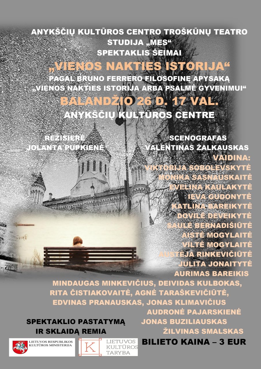 17 val. AKC – Troškūnų teatro studija „MES“ ir Anykščių kultūros centro teatras pristato spektaklį „VIENOS NAKTIES ISTORIJA“ pagal Bruno Ferrero apysaką. Režisierė Jolanta Pupkienė.