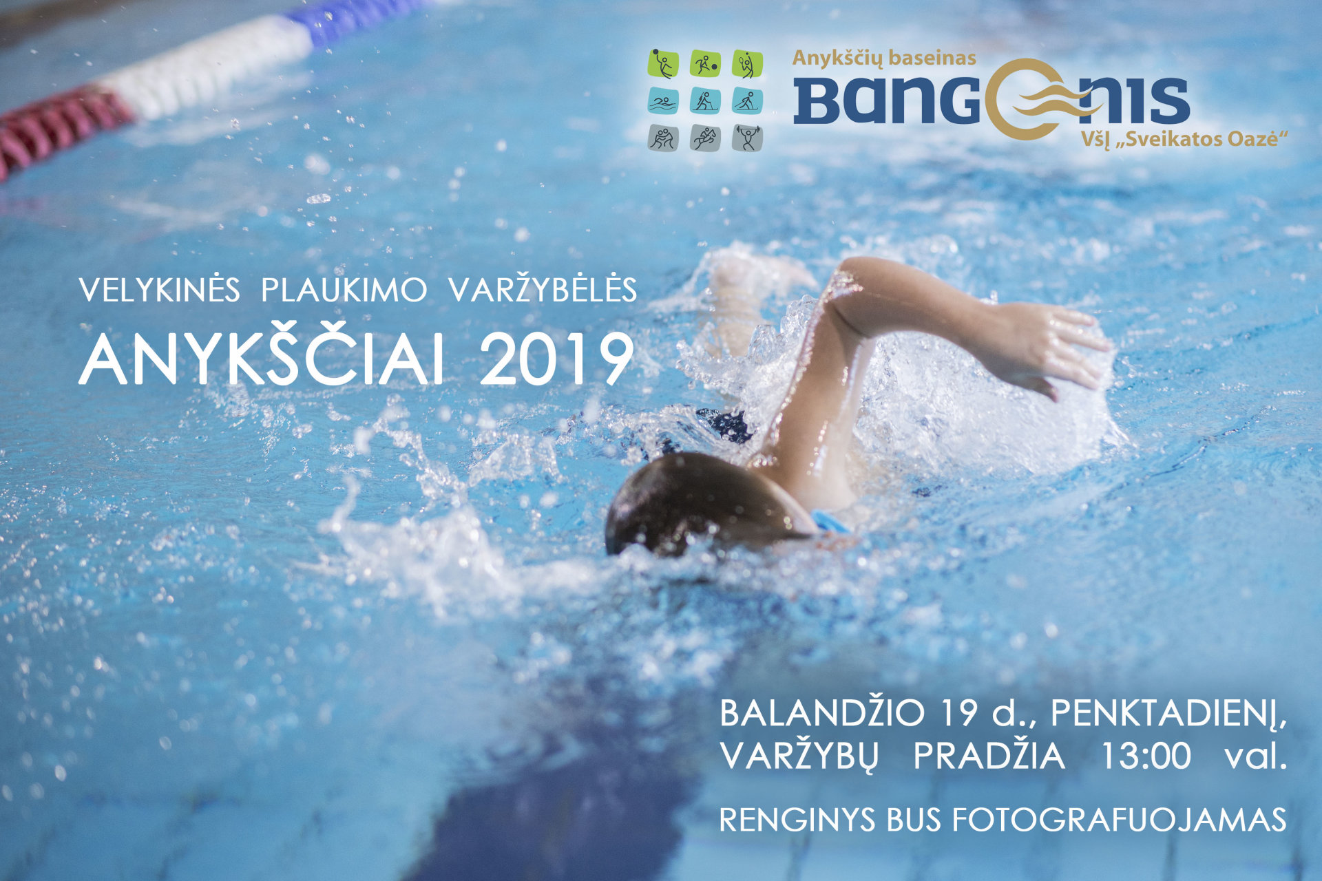 Kviečiame š. m. balandžio 19 d., 13.00 val. visus norinčius Anykščių miesto ir rajono bendrojo lavinimo mokyklų 1-4 klasių mergaitės ir berniukus, taip pat 5-9 klasių mokinius, kurie lanko Anykščių rajone kitas (ne tik plaukimo) neformaliojo vaikų švietimo programas, dalyvauti varžybėlėse, kurios vyks Anykščių baseine BANGENIS.